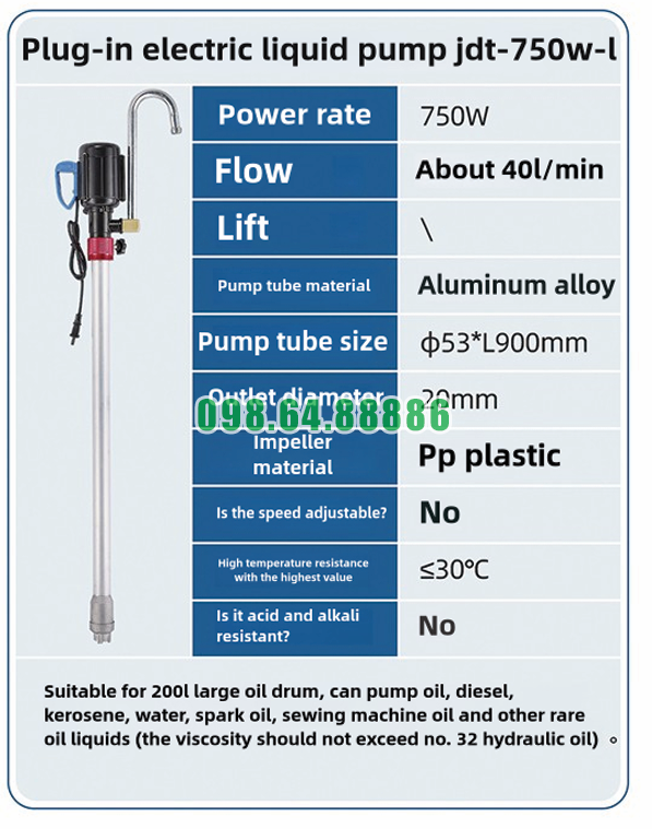 Vỏ nhôm có khả năng chống ăn mòn rất tốt, đặc biệt trong các môi trường có tiếp xúc với dầu và chất lỏng có tính ăn mòn nhẹ. Máy bơm điện hút thùng phuy vỏ nhôm JDT-750W-L thường được sử dụng để bơm các loại dầu, diesel, dầu hỏa, và các chất lỏng có thể gây ăn mòn đối với các vật liệu khác như thép hay inox. Vỏ nhôm giúp bảo vệ máy khỏi sự hư hỏng do tác động của các hóa chất, kéo dài tuổi thọ của máy bơm.