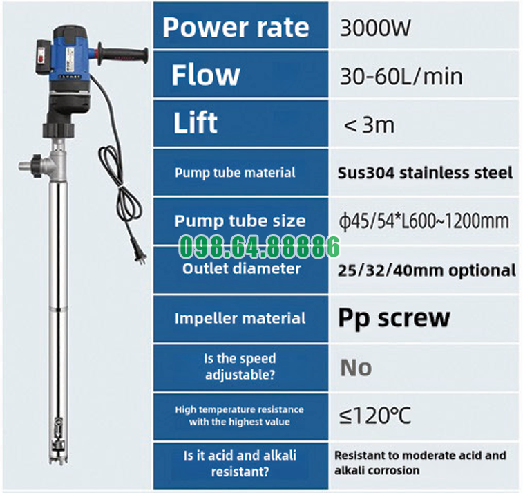 Máy bơm thùng phuy inox JDT-3000W-LGG120 được thiết kế để mang lại hiệu suất làm việc cao trong quá trình bơm và chiết rót chất lỏng. Với động cơ công suất lớn, cấu trúc bơm trục vít ổn định và vật liệu bền bỉ, thiết bị giúp quá trình vận chuyển chất lỏng diễn ra nhanh chóng và liên tục trong môi trường công nghiệp.