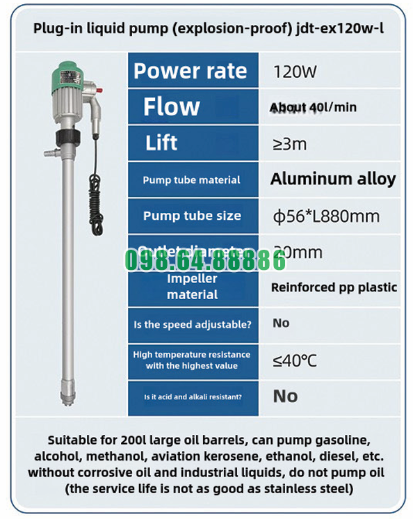 Máy bơm chất lỏng cắm trực tiếp chống cháy nổ JDT-EX120W-L có thể sử dụng cho xăng, ethanol, methanol, diesel… giúp tăng tính linh hoạt trong ứng dụng.