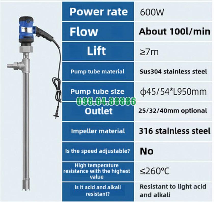 Bơm chìm hút thùng phuy nhiệt độ cao JDT-600W-G260 được thiết kế đặc biệt để xử lý các loại chất lỏng có nhiệt độ lớn, thường gặp trong công nghiệp hóa chất, dầu nhớt, dung môi hoặc các vật liệu nóng chảy. Nhờ cấu tạo chịu nhiệt và nguyên lý vận hành tối ưu, thiết bị hoạt động ổn định ngay cả trong môi trường nhiệt độ khắc nghiệt.